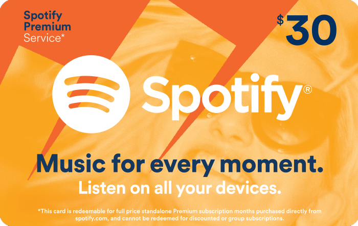Spotify $30 eGift | Tops Markets Choose Card Type. eGift Card. Physical Gift Card. Select an amount. $30. › Spotify-Gift-Cards-Email-DeliverySpotify Premium 3 Month Subscription $30 Gift Card - Email ... You will receive a physical gift card in the mail. Redemption: Online; No returns and no refunds on gift cards. Millions of songs and thousands of podcasts. Play on-demand and offline, anywhere. All your music is ad-free, uninterrupted and in high quality audio. ASIN : B081611N8B; Best Sellers Rank: #141 in Gift Cards (See Top 100 in ...