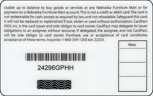 Nebraska Furniture Mart Gift Card Starting at: $6.95 + gift card value Gift card amounts up to $1,000 USPS First-Class or Priority shipping Personalize the envelope and card Greeting card is 6in x 4in This gift card is suggested for use at Nebraska Furniture Mart but it may be used everywhere Debit MasterCard is accepted. Nebraska Furniture MartGift Card