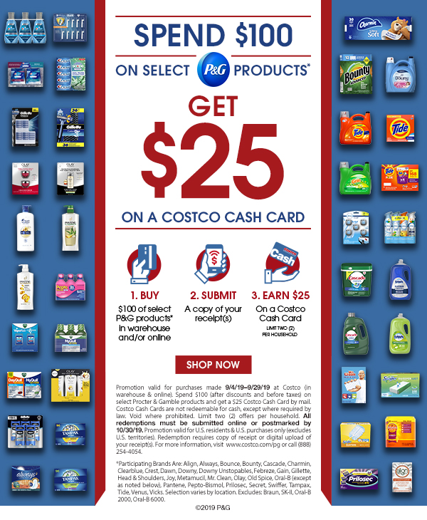 Costco P&G Promotion for 2021 | MyWholesaleLife When you purchase $100 worth of P&G items, you will get a $25 Costco Gift Card by mail! The catch is you must submit your recipes online here BY 10/30/21. You can do this deal in-store or online. Here's How It Works: Spend $100 on select P&G items at Costco. Submit a copy of your recipet online here Get a $25 Costco Shop Card Mailed to you